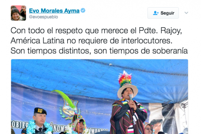 “Con todo el respeto que merece el Pdte. Rajoy, América Latina no requiere de interlocutores. Son tiempos distintos, son tiempos de soberanía”, escribió Morales en su cuenta de Twitter.