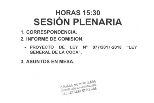 La Sesión Ordinaria del pleno de la Cámara de Diputados tiene agendado el informe de comisión y tratamiento del Proyecto de ley Nº 077/2018-2018 “Ley General de la Coca” para mañana martes 21 de febrero.