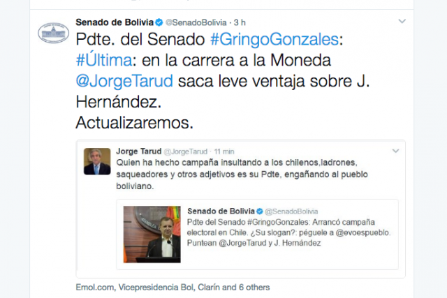 Finalmente, El presidente del Senado “@JorgeTarud presidente 2018.¿Dios salve a Chile! cambio y fuera”. Y la respuesta de Tarud fue “Dios se apiade del pueblo boliviano con dirigentes que los engañan, les mienten y quieren eternizarse en el poder, como los dictadores”. Ahí terminó el intercambio.
