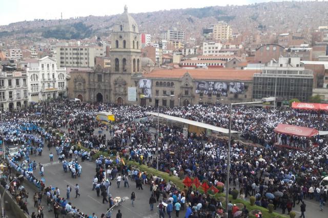 Las cuatro marchas planificadas en la ciudad de La Paz dentro de la iniciativa "Marea azul" se dieron cita en la plaza de San Francisco. De ellas participaron unidades educativas, las fuerzas armadas y del orden, instituciones y autoridades nacionales.