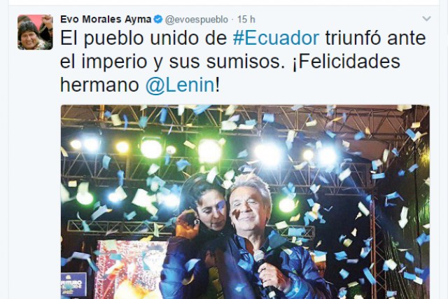 “El pueblo unido de #Ecuador triunfó ante el imperio y sus sumisos. ¡Felicidades hermano @Lenin!”, publicó Morales en su cuenta de Twitter ayer, al conocerse los primeros resultados que daban por ganador a Moreno.