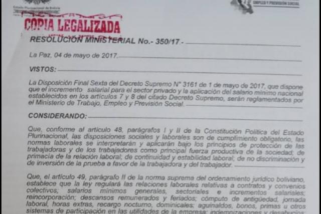 El Ministerio de Trabajo presentó hoy la Resolución Ministerial No. 350/17 del reglamento al incremento salarial que fue decretado el pasado 1 de mayo. Éste no será obligatorio para alcaldías ni gobernaciones, y en el caso de las empresas tampoco para altos cargos jerárquicos.