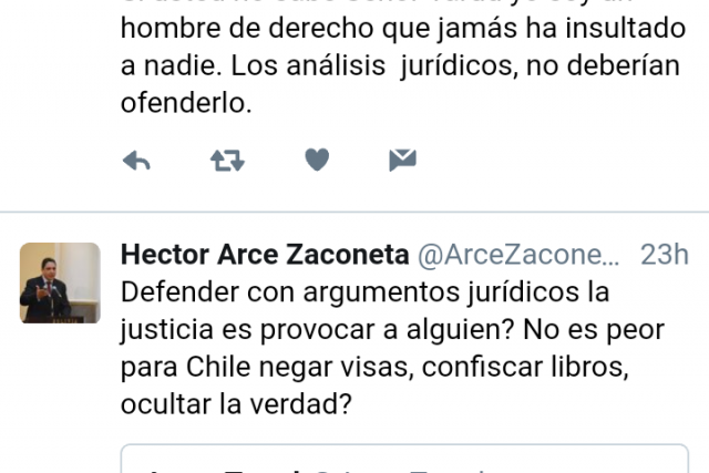 El ministro boliviano respondió "Defender con argumentos jurídicos la justicia es provocar a alguien? No es peor para Chile negar visas, confiscar libros, ocultar la verdad?"