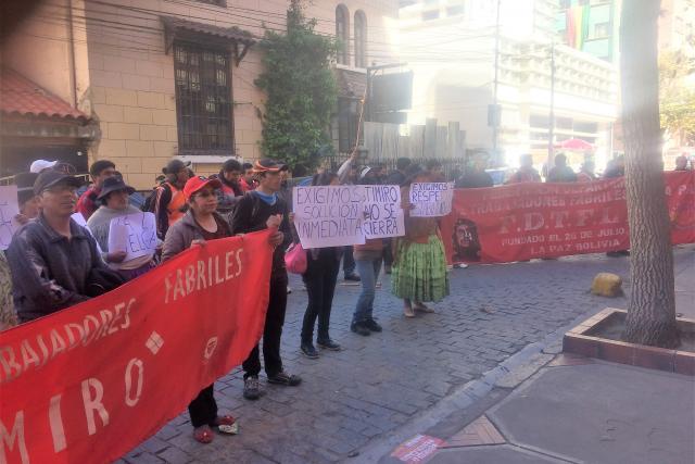 Después de varios días de protesta en la fábrica, los trabajadores de la empresa Stimiro S.R.L. se trasladaron a la calle Fernando Guachalla en la zona de Sopochachi de la ciudad de La Paz para reclamar por los despidos de 30 trabajadores de la empresa. La Federación de trabajadores fabriles acompaña la marcha y busca un acercamiento con el Ministerio de Trabajo.