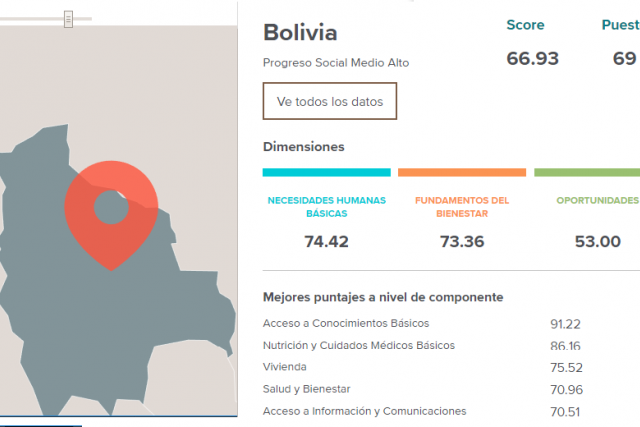 Los mejores aspectos resaltados del progreso social boliviano son en acceso rural a fuentes de agua mejoradas, tasa de alfabetización de los adultos, tratamiento de aguas residuales, esperanza de vida y derechos políticos. Entre los aspectos a mejorar según el índice está el derecho a la propiedad privada, las tasas de suicidio,  las emisiones de gases de efecto invernadero, el acceso a infraestructura de saneamiento mejorada y las muertes por accidentes de tráfico.
