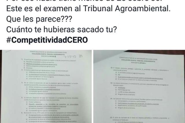 “Por eso nadie tiene menos de 25 sobre 30. Este es el examen al Tribunal Agroambiental. Que les parece??? Cuánto te hubieras sacado tú?”, escribió el diputado Santamaría.