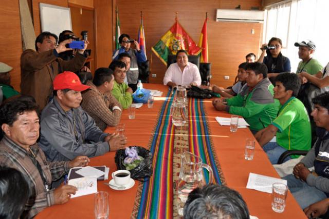 Hoy en horas de la tarde se reunieron los dirigentes de la Asociación Departamental de productores de Coca de La Paz (Adepcoca) con el presidente del TCP Oswaldo Valencia Alvarado y el magistrado Zenón Hugo Bacarreza Morales, ocasión en la que los juristas informaron sobre el avance del recurso de inconstitucionalidad presentado por los cocaleros en mayo pasado.