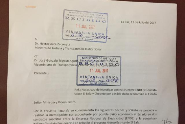 Pablo Solón presentó una misiva denuciando un posible daño económico al Estado por los contratos realizados entre la empresa estatal ENDE y la italiana Geodata Engineering sobre el proyecto hidroeléctrico Chepete – Bala en el norte de La Paz. La misiva fue enviada al ministro de Justicia, Héctor Arce, y al Viceministro de Transparencia Institucional y Lucha contra la Corrupción, Gonzalo Trigoso, solicitando una investigación sobre dichos contratos.