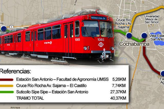 La construcción del proyecto demorará tres años y necesitará una inversión de 447 millones de dólares, operará con electricidad, con 42 kilómetros, atravesará los municipios de Sipe Sipe, Vinto, Quillacollo, Cercado, Colcapirhua y Sacaba, tendrá 43 paradas y 12 trenes que transportarán a 200 personas a una velocidad de 80 kilómetros por hora.