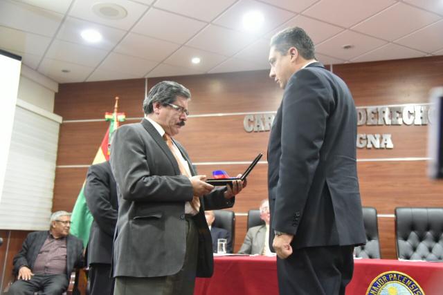 El acto de reconocimiento fue realizado en el Aula Magna de la carrera de Derecho y Ciencias Políticas, con la presencia del Rector de la casa de estudios superiores, Waldo Albarracín, Decano del Facultad de Derecho, Franz Remy Camacho, autoridades universitarias, docentes  e invitados especiales.