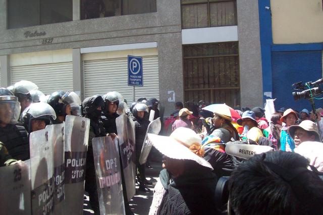 La marcha que partió esta mañana desde El Alto, llegó pasado el medio día hasta la plaza de San Pedro. En su intento de ingresar, en la calle Cañada Stronguest, la cabeza de la marcha tuvo un encuentro con una barrera policial, inicialmente las mujeres se arrodillaron, pero al no lograr el movimiento de la Policía, empujaron a los efectivos hasta romper sus filas.