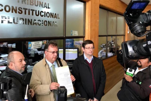 Este viernes, los senadores de Unidad Demócrata, Oscar Ortiz y Arturo Murillo, junto al abogado constitucionalista Carlos Alarcón, presentaron ante el Tribunal Constitucional Plurinacional (TCP), en Sucre, una solicitud de rechazo a la acción de inconstitucionalidad abstracta presentada por el MAS que busca de que el presidente Evo Morales y las autoridades electas puedan habilitarse a las próximas elecciones.