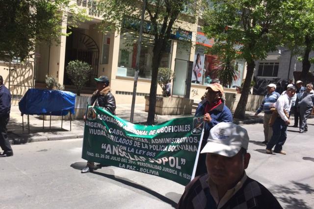 Los policías jubilados realizaron hoy una marcha y bloqueo de las calles 20 de Octubre y 6 de Agosto en Sopocachi exigiendo que los aportes de su reserva pasiva sea tomado en cuenta dentro de su jubilación.
