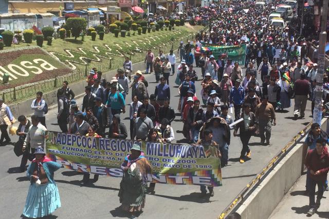 Los cocaleros de Los Yungas, organizados en la Asociación Departamental de Productores de Coca (Adepcoca) realizaron una marcha hoy en la sede de gobierno rechazando el reglamento de la Ley General de la Coca. Recordaron que aún esperan el pronunciamiento del Tribunal Constitucional Plurinacional (TCP) sobre la acción presentada contra esta norma.