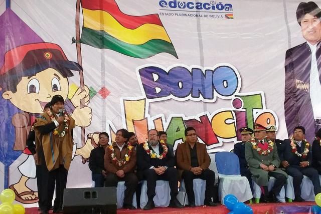 Este año se destinará más de 461 millones de bolivianos para el pago del beneficio, de 200 bolivianos a cada alumno. Este lunes se inició el pago del bono en todo el país con un acto en el que participó el presidente Morales, realizado en la unidad educativa América 1 de la calle Juancito Pinto de la zona Chijini de El Alto.