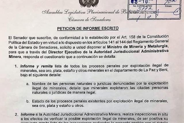 Por ello, el senador envió una carta a la AJAM solicitando se realice una inspección para verificar posible extracción ilegal de oro y otros minerales en Teoponte, Guanay, Tipuani y Mayaya en La Paz e incluso Rurrenabaque en el Beni.