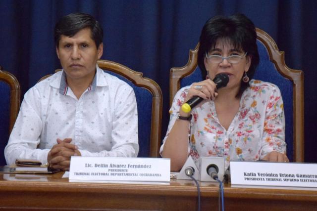 Delfín Álvarez, presidente del TED Cochabamba junto a la presidenta del TSE, Katia Uriona. Foto: TED Cochabamba