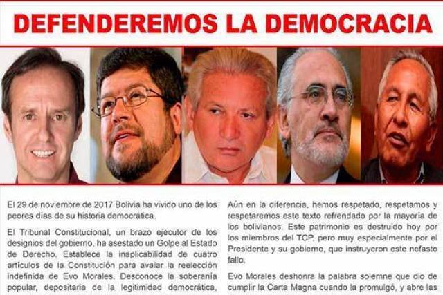 Consideran que Morales “deshonra la palabra solemne que dio de cumplir la Carta Magna cuando la promulgó y abre las compuertas para que Bolivia vaya en la ruta totalitaria en la que ya está la sufrida República de Venezuela”. Indican que Bolivia ha construido un “incalculable patrimonio democrático” en los últimos 35 años que ha sido “destruido por los miembros del TCP, pero muy especialmente por el Presidente y su gobierno, que instruyeron este nefasto fallo”.