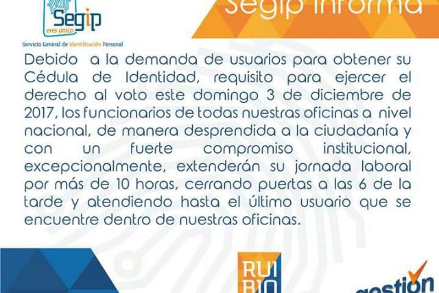 Debido a la demanda de documentos de identidad para poder emitir el voto el domingo 3 de diciembre, el Servicio General de Identificación Personal (Segip) determinó que atenderá en sus oficinas hasta las 6 pm.