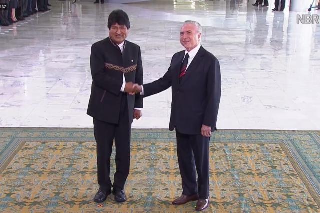 El presidente de Brasil, Michel Temer, recibió hoy, con honores, a su homólogo boliviano Evo Morales. Ambos mandatarios, a pesar de sus ‘diferencias iedológicas’, sostienen una reunión en el Palacio de Planalto, en Brasilia, para abordar temas de integración, energía y cooperación.