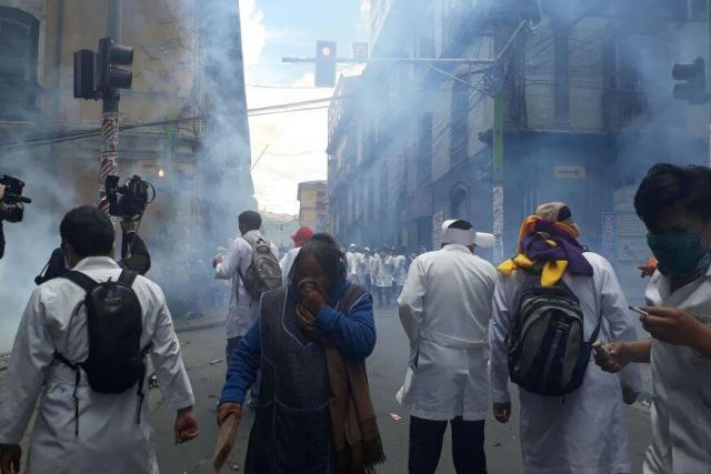 Los policías, para evitar el ingreso de los galenos, tuvieron que hacer uso de agentes químicos. De acuerdo con imágenes televisivas, los manifestantes, con mandiles blancos, emplearon piedras, palos y otros artefactos para intentar ingresar a plaza Murillo por el acceso ubicado entre las calles Indaburo y Bolívar, señaló Página Siete.