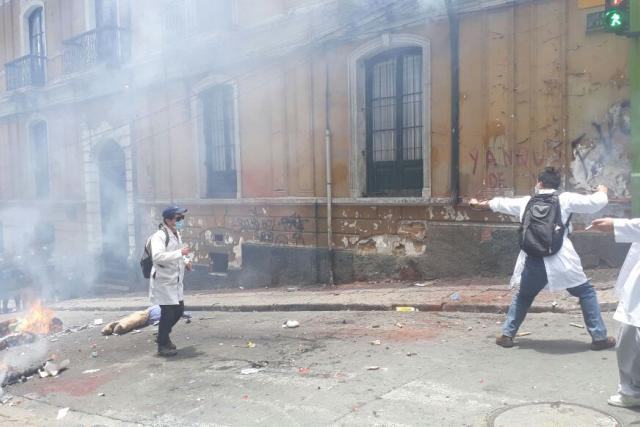 Alrededor del mediodía de hoy, estudiantes y profesionales de salud que marchaban protagonizaron un enfrentamiento con efectivos policiales en alrededores de la Plaza Murillo.