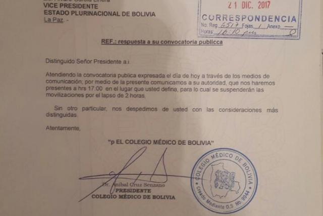 El presidente de la Cámara de Senadores, José Alberto Gonzales, informó esta tarde que el colegio Médico de Bolivia hizo llegar una carta a la Vicepresidencia del Estado señalando que aceptaban levantar sus medidas de presión por 2 horas para entablar el diálogo con el presidente en ejercicio Álvaro García Linera; sin embargo, esta propuesta fue rechazada por el Gobierno por considerarla “poco seria”.