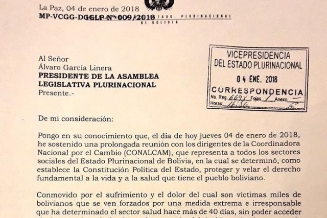 La información la dio el Viceministro de Coordinación Gubernamental, Javier Valdivieso, en una conferencia de prensa en la que leyó la carta que Morales envió a Álvaro García Linera como presidente de la Asamblea Legislativa pidiendo que “se inicie el procedimiento legislativo correspondiente” con los artículos mencionados. La carta habría sido recibida en la Vicepresidencia a las 16:36 de hoy.