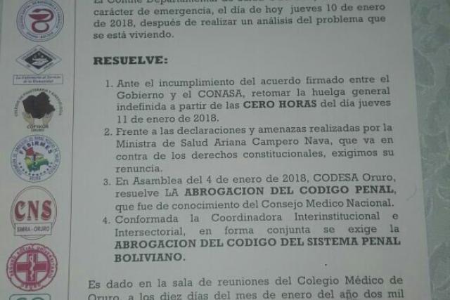 Ayer lo anunció el Comité Departamental de Salud (Codesa) de Cochabamba y hoy le siguió Oruro. Los médicos de esa organización en la ciudad del Pagador decidieron retomar su huelga de hambre, además de exigir la renuncia de la mencionada autoridad estatal.