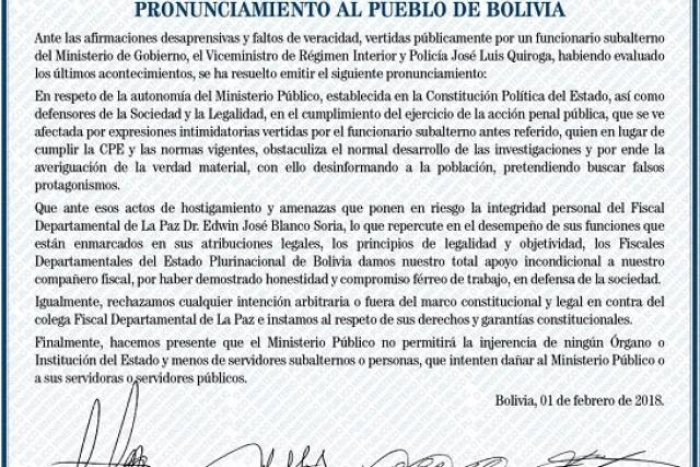 “Ante estos actos de hostigamiento y amenazas que ponen en riesgo la integridad personal del fiscal Departamental de La Paz, Edwin José Blanco Soria, lo que repercute en el desempeño de sus funciones que están enmarcados en sus atribuciones legales, los principios de legalidad y objetividad, los fiscales departamentales del Estado Plurinacional de Bolivia damos nuestro total apoyo incondicional a nuestro compañero fiscal, por haber demostrado honestidad y compromiso férreo de trabajo, en defensa de la sociedad”, señala el comunicado conjunto de los fiscales departamentales del país.