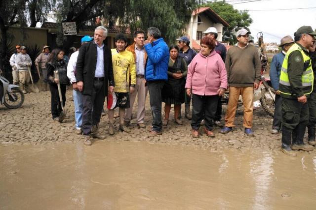 Anunció que se desplazará más maquinaria pesada para sacar el lodo y el agua de las calles y las viviendas anegadas; y que se gestiona con la Policía Boliviana y las Fuerzas Armadas el refuerzo de la seguridad.