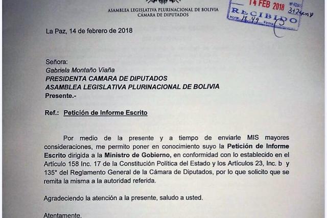 La petición fue presentada a la presidenta de la Cámara de Diputados, Gabriela Montaño, y acompañado de un cuestionario de 13 preguntas. En el mismo, Barrientos pide información sobre las explosiones ocurridas los días 10 y 13 de febrero en Oruro, el lugar donde éstos ocurrieron, la cantidad de fallecidos, heridos y la situación de salud actual de estos últimos.
