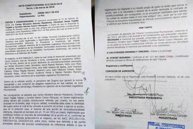 “Rechazar el memorial que precede, presentado por Carlos Silvestre Alarcón Mondonio, Christian Jesús Tejada Tejada y Cynthia Marlen Coscio Márquez, por no ser parte en la acción constitucional referida”, señala el Auto Constitucional 012/2018 – CA/S del 1 de marzo de 2018.