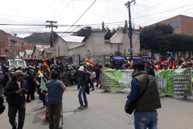 Ayer, la marcha de Adepcoca terminó en una gasificación, luego de que los productores fueron impedidos de ingresar a los predios de la institución, en la zona de Villa Fátima. Los mismos habían ratificado a Franklin Gutiérrez como presidente y buscaban desalojar al Comité Ad Hoc que la semana pasada tomó los predios.