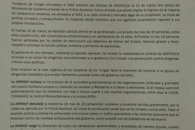 La Asamblea Permanente de Derechos Humanos de La Paz (APHDLP) emitió un comunicado para referirse al conflicto de la Asociación Departamental de Productores de Coca (Adepcoca).