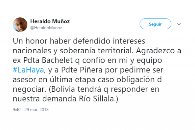 “Un honor haber defendido intereses nacionales y soberanía territorial. Agradezco a ex Pdta Bachelet que confió en mi y equipo #LaHaya, y a Pdte Piñera por pedirme ser asesor en última etapa caso obligación de negociar. (Bolivia tendrá q responder en nuestra demanda Río Silala)”, publicó Muñoz.