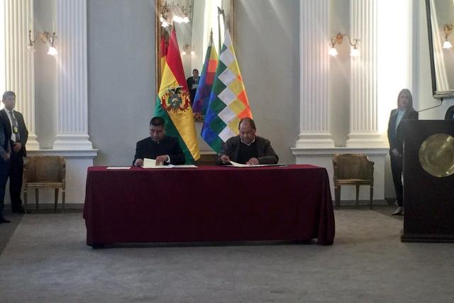 El acuerdo interinstitucional fue suscrito por Canciller del Estado boliviano, Fernando Huanacuni, y el titular del Ministerio de Gobierno, Carlos Romero.