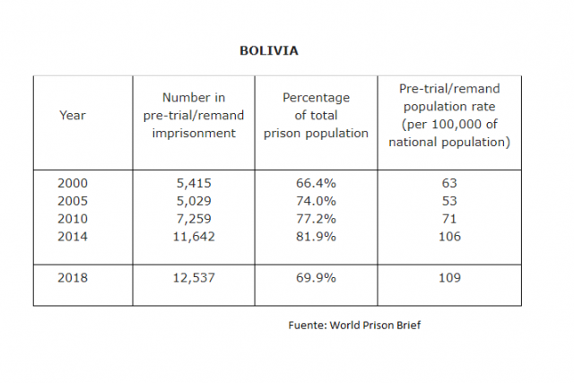 Asimismo, el informe ubica a Bolivia en el Número 12 en el mundo en cuanto a detención preventiva y 8 en hacinamiento. El informe señala que se tomaron datos de la Dirección Nacional de Régimen Penitenciario.