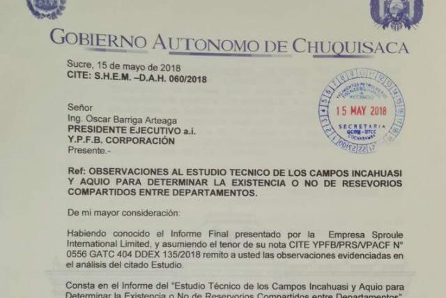 La Gobernación de Chuquisaca envió hoy a Yacimientos Petrolíferos Fiscales Bolivianos (YPFB) una carta con las observaciones al estudio realizado por la empresa Sproule International Limited sobre el campo Incahuasi, que establece que éste está en Santa Cruz en su totalidad. Reclaman el acceso a la información.