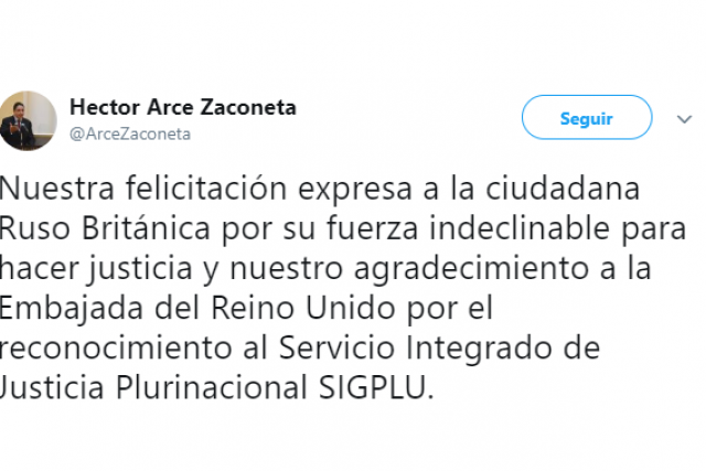 “Nuestra felicitación expresa a la ciudadana Ruso Británica por su fuerza indeclinable para hacer justicia y nuestro agradecimiento a la Embajada del Reino Unido por el reconocimiento al Servicio Integrado de Justicia Plurinacional SIGPLU (sic)”, escribió Arce en su cuenta de Twitter.