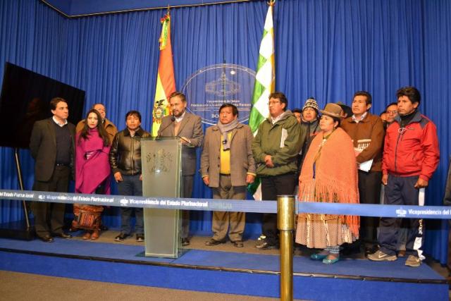 Los ministros de la Presidencia, Alfredo Rada; de Economía, Mario Guillén; de Educación, Roberto Aguilar; de desarrollo rural, César Cocarico y de Culturas, Wilma Alanoca se reunieron en la vicepresidencia con un grupo de dirigentes de la Federación de Juntas Vecinales (Fejuve), encabezado por el dirigente Sandro Ramirez, de la Central Obrera Regional (COR), y de los gremiales.