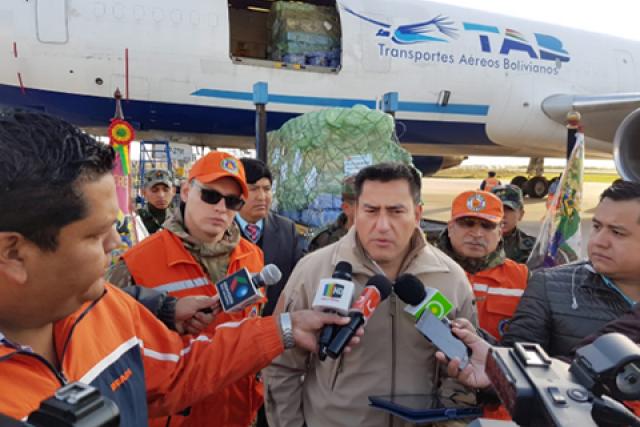 "Son siete toneladas de arroz, más ocho toneladas de azúcar y harina, 350 carpas, 2.450 frazada, 900 equipos de higiene personal, 1050 de limpieza de los campamentos, 700 raciones secas de alimentos y 350 equipos de cocina, en total se han embarcado 46 toneladas", dijo a los periodistas, en el aeropuerto Viru Viru.
