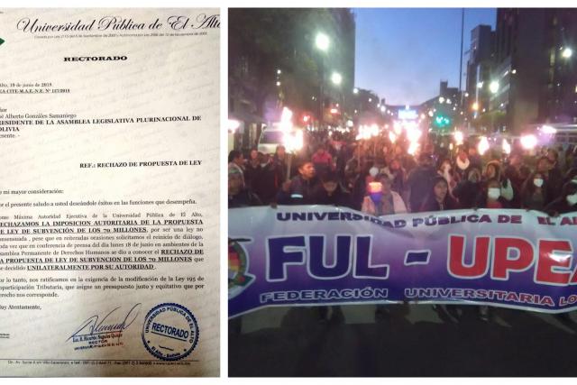 Además, añade que el pasado 18 de junio se dio a conocer el rechazo a la mencionada norma ya que, asegura, “fue decidida unilateralmente” por el Gobierno. En ese sentido, antes de salir en una ‘marcha de teas’, los representantes universitarios y docentes de la UPEA advirtieron que en caso de aprobarse la Ley, marcharán hasta lograr su aprobación.