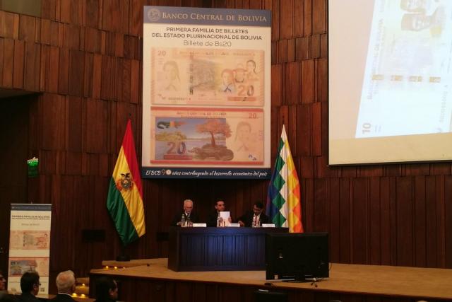 El Banco Central de Bolivia (BCB) presentó hoy el nuevo billete de 20 bolivianos, el segundo de la familia de billetes del estado Plurinacional de Bolivia. En un acto realizado en instalaciones de la entidad bancaria, con la presencia del ministro de Economía, Mario Guillén, y el presidente del BCB, Pablo Ramos, se dio a conocer los detalles del nuevo billete boliviano.