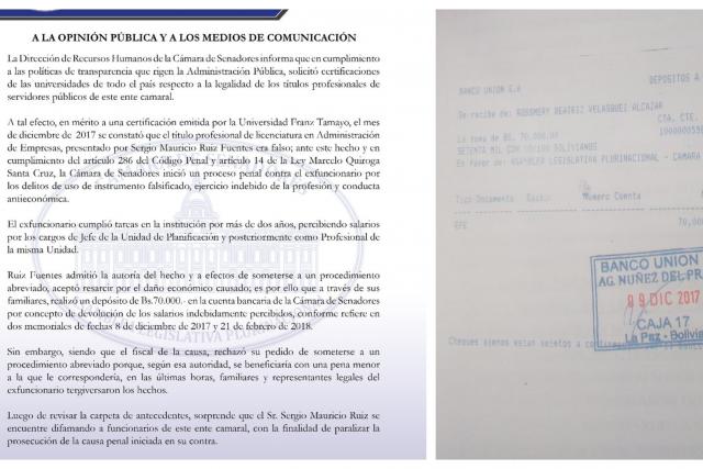 Además, aclara que el exfuncionario admitió su culpa y trató de resarcir el daño económico causado depositando la suma de 70 mil bolivianos a cuentas del Senado.