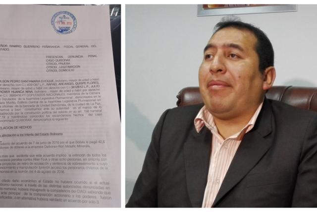 Los diputados de Unidad Demócrata (UD), Wilson Santamaría, Rafael Quispe y Julio Huanca presentaron ante el Ministerio Público una denuncia formal por el caso Quiborax en contra del fiscal departamental de La Paz, Edwin Blanco; de los ministros de Justicia, Héctor Arce y de Minería, César Navarro; del procurador general del Estado, Pablo Menacho; de la exministra de Defensa Legal del Estado, Elizabeth Arismendi ;y la exsubprocuradora, Carmiña Llorenti.