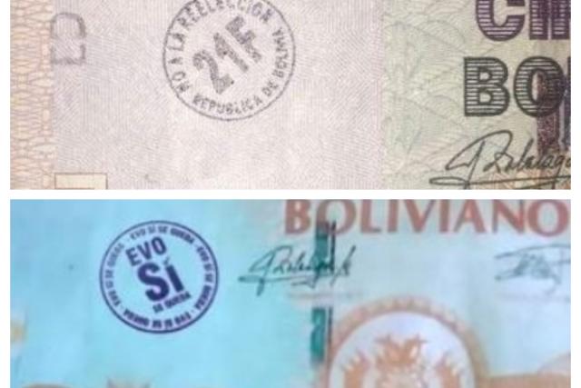 En los últimos días aparecieron billetes sellados con las frases ’21 –F’ y ‘Evo Sí’, aludiendo a la pelea electoral por la repostulación o no del presidente Evo Morales en las elecciones generales del 2019.