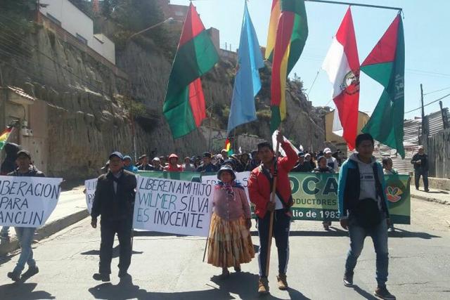 Los productores de coca de Los Yungas marchan por segundo día por el centro de la ciudad de La Paz, pidiendo la liberación de sus dirigentes Franklin Gutierrez y Juan Carlos Paco, detenido en las últimas horas; además piden la salida de su territorio de la Fuerza de Tarea Conjunta de La Asunta, encargada de la erradicación de coca en la zona.