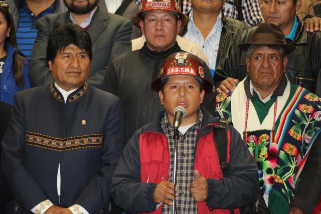 El dirigente de la COB, Juan Carlos Guarachi, junto al presidente Morales en la Casa Grande del Pueblo.