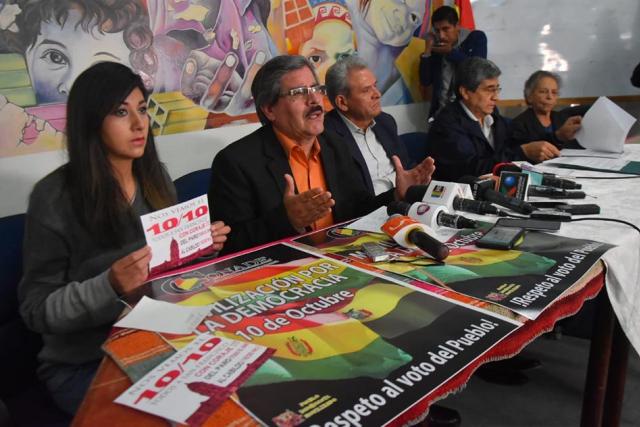 El Comité Nacional de Defensa de la Democracia (Conade), en conferencia de prensa, convocó hoy a una gran marcha nacional para el 10 de octubre con embanderamiento, bloqueos y cabildos “por la defensa del sistema democrático” y por el respeto de los resultados del referéndum del 21F de 2016 que negó al presidente Evo Morales la posibilidad de ser candidato nuevamente.